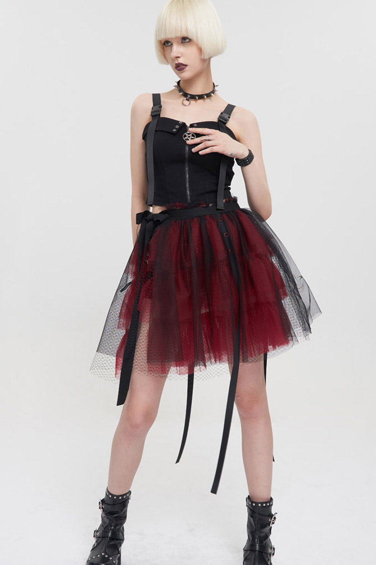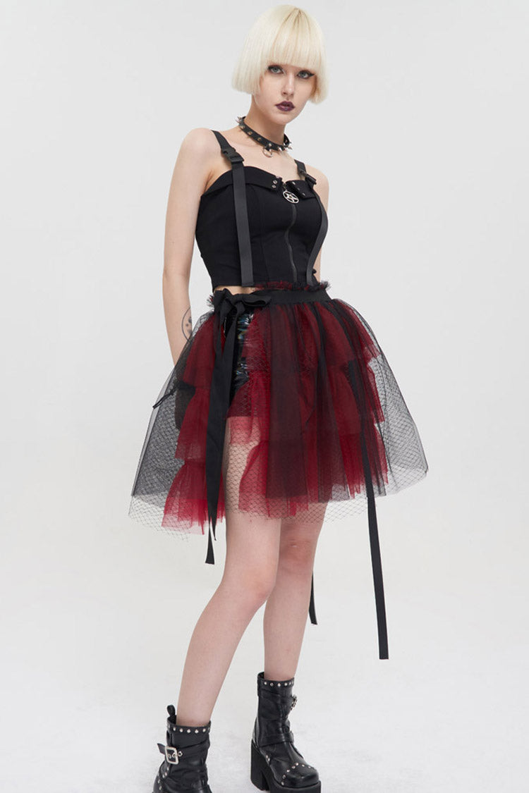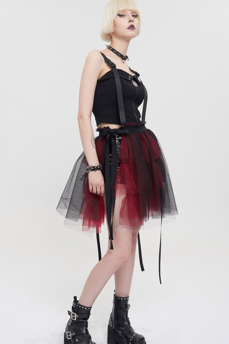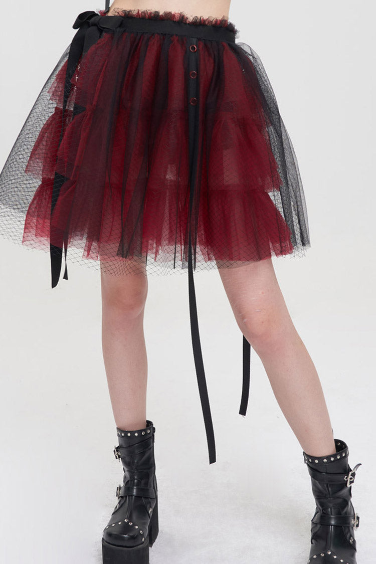 The main fabric is made of red ruffled mesh material with black mesh material. Elastic waistband, one-piece fit, worn over shorts.
