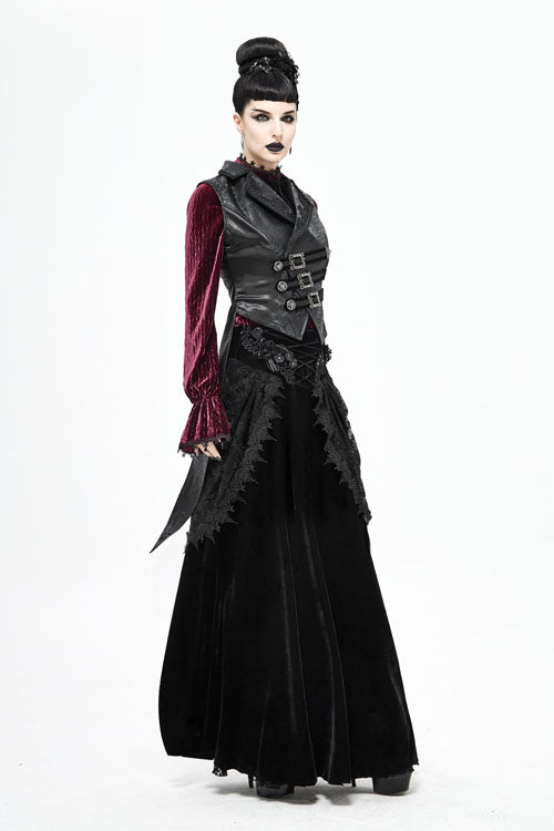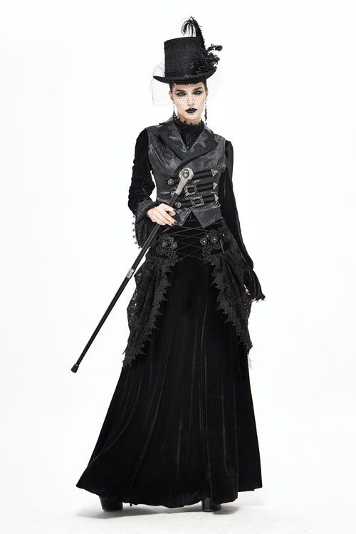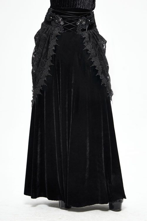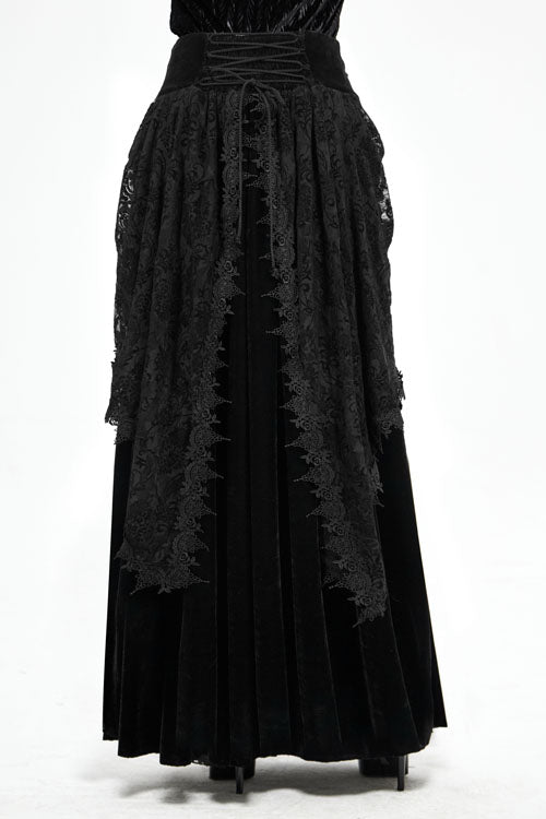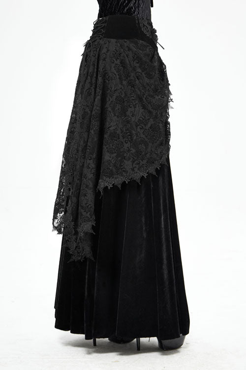 "The main fabric is made of stretchy velvet, with flocking lace mesh on both sides. Mid-waist long skirt. The front panel is appliqued lace and decorated with a drawstring, and the center back is pleated with elastic bands, and Invisible zipper on the side. The lace flower mesh is pasted with fringe lace along the edges."
