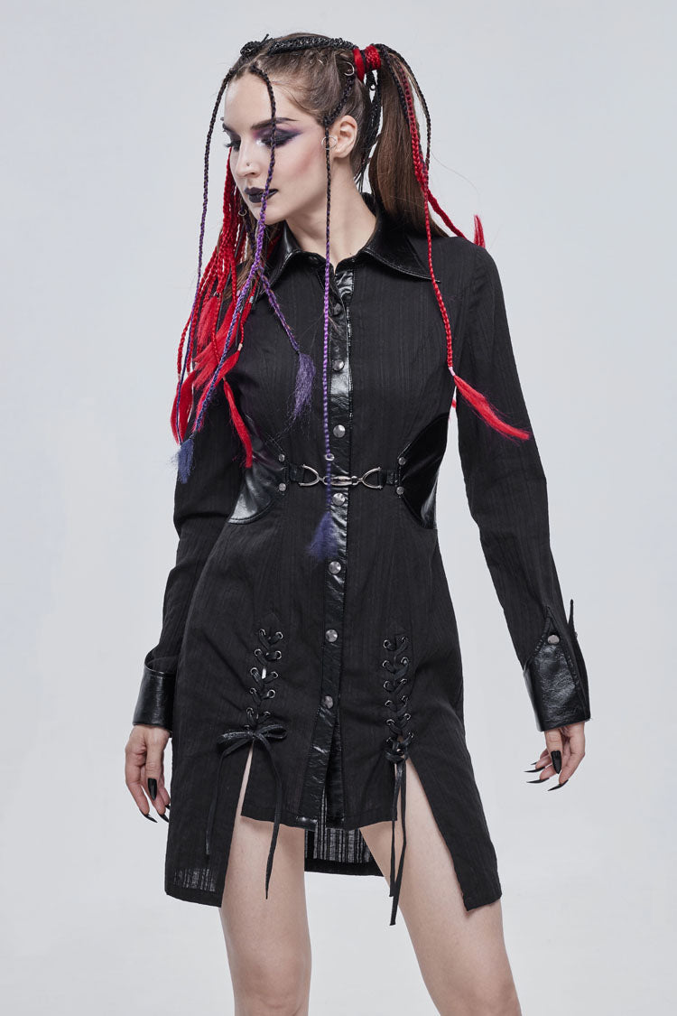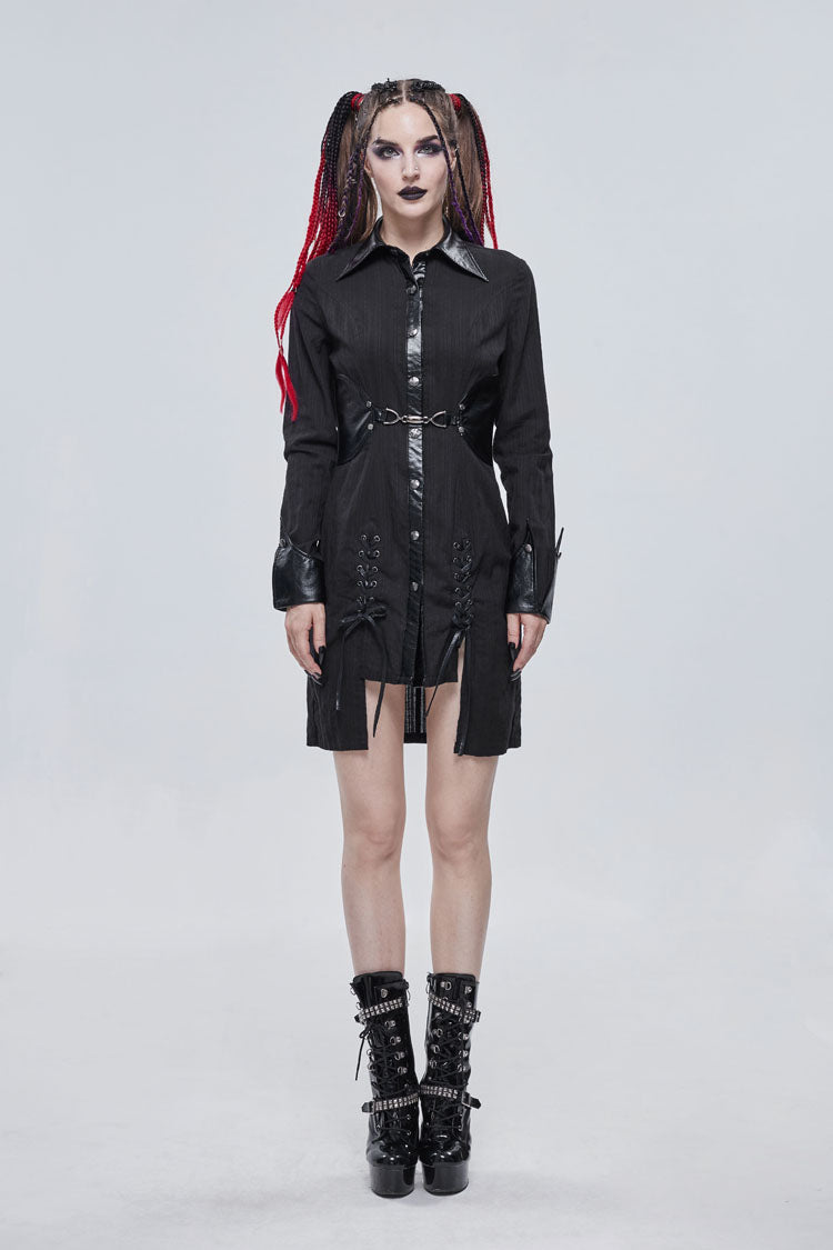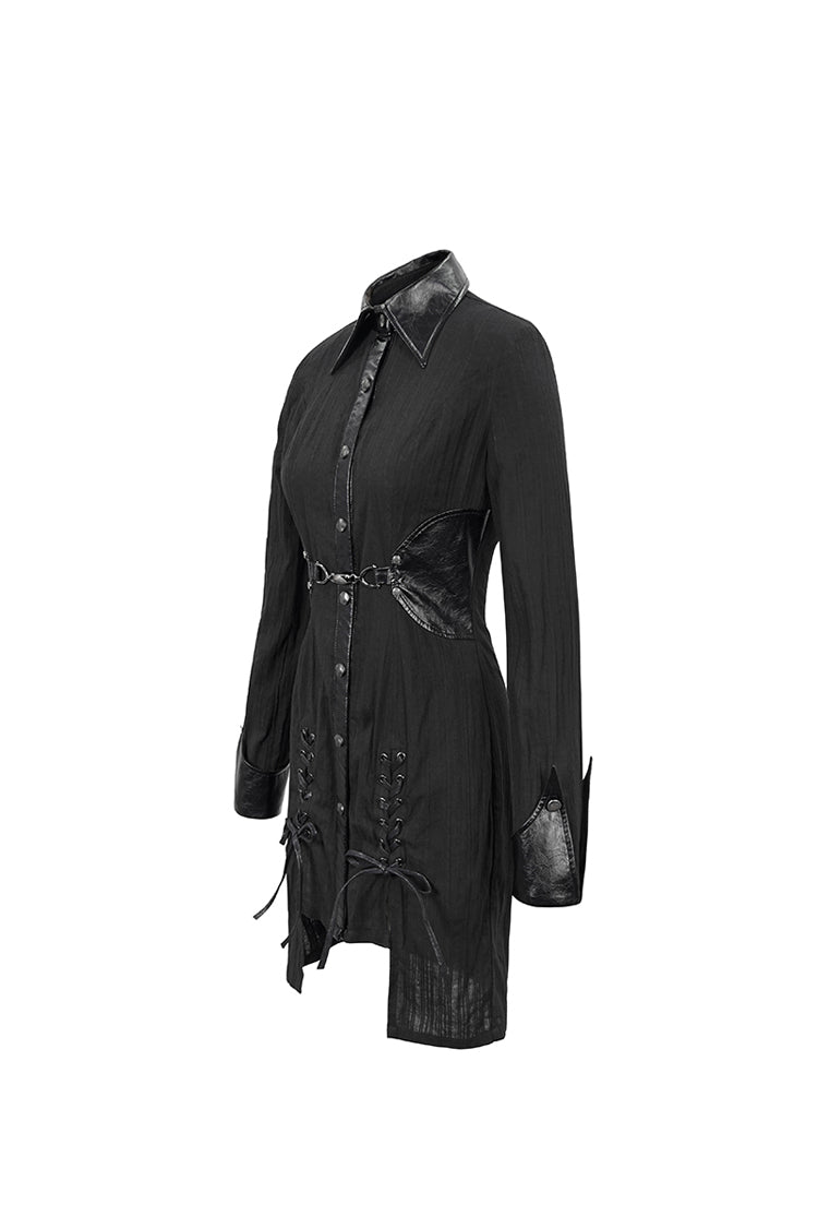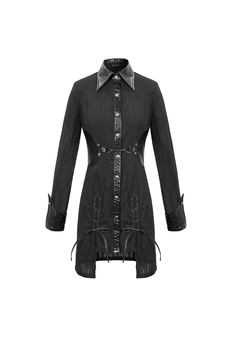The main material is shirting material with vertical stitching, the collar and waist are made of leather, and the front center is decorated with a metal buckle design. The whole garment reaches into the thighs.
