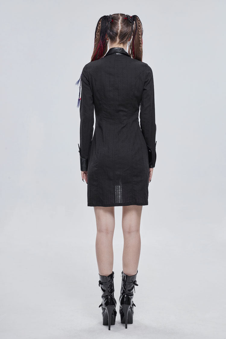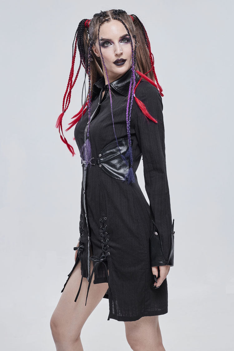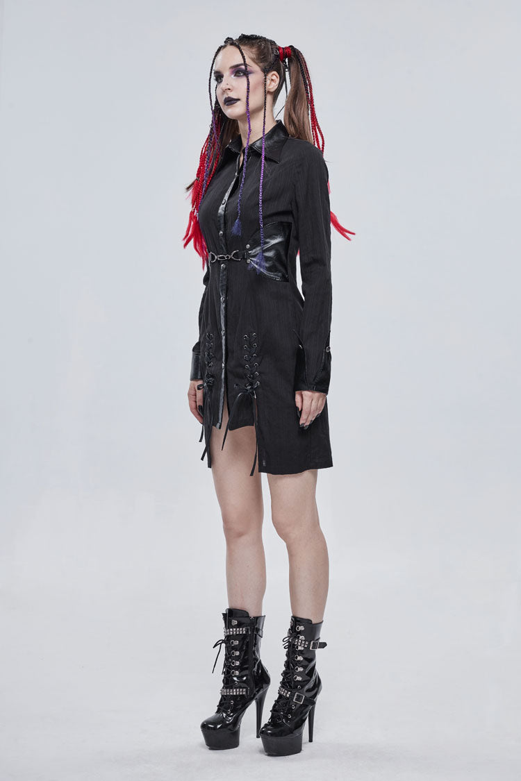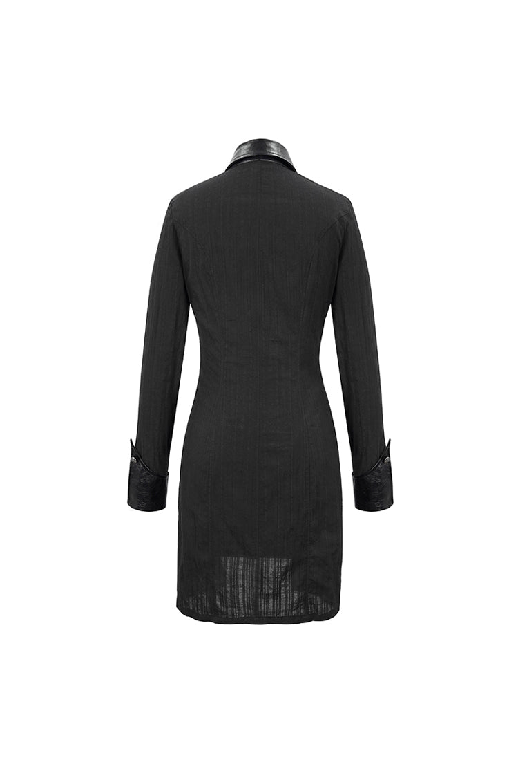 The main material is shirting material with vertical stitching, the collar and waist are made of leather, and the front center is decorated with a metal buckle design. The whole garment reaches into the thighs.