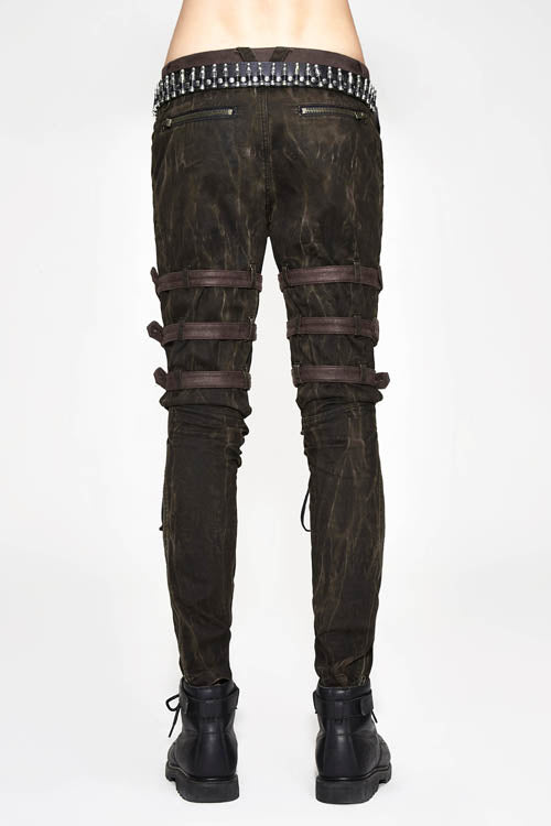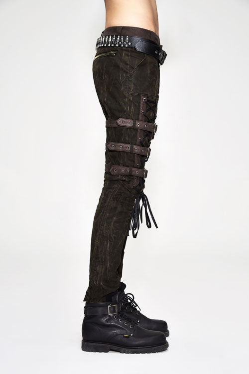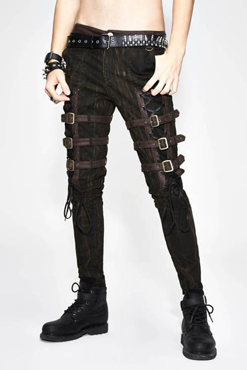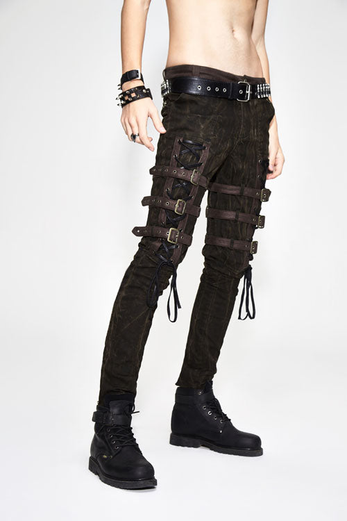 Black and coffee fabric through washing water and embroider process to wash out the brown irregular pattern, tied with rope on the thigh, with brown heat seal backing fabric to make the leather loops,the leather loops can be adjusted.