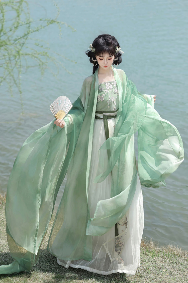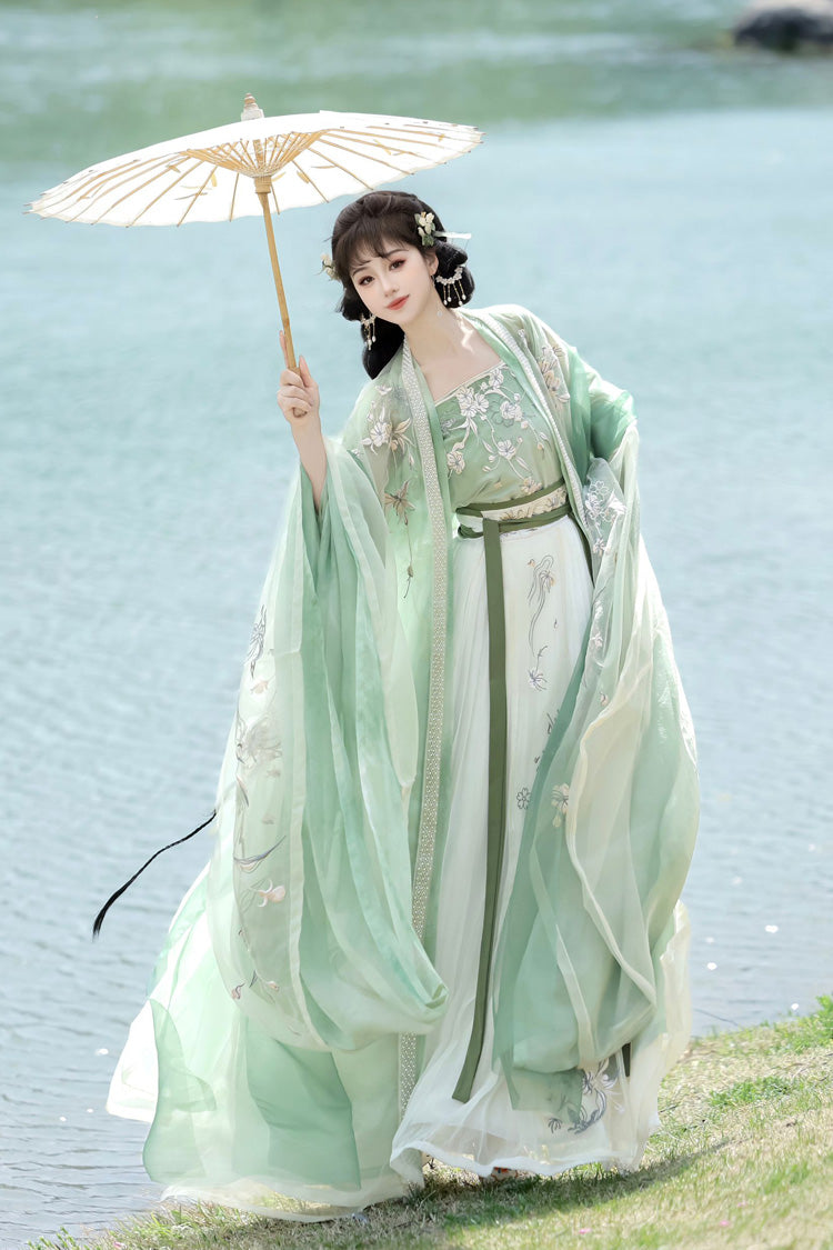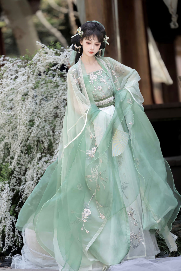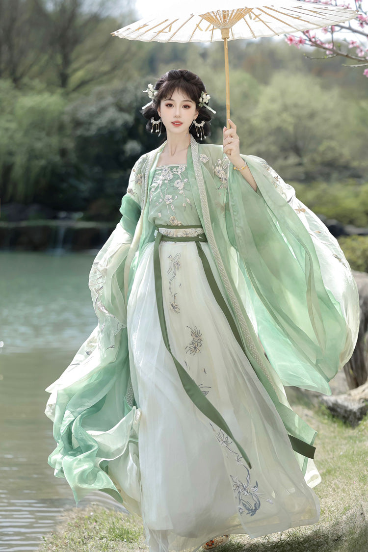 Include: Outer Wide-sleeve Shirt + Inner Wide-sleeve Shirt + 4.5-meter Hem Skirt Dress + Embroidered Camisole + Draping Shawl + Double-layered Winged Sleeves