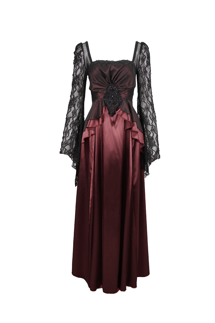The main fabric is made of a red soft satin woven fabric with lace mesh and crepe chiffon fabric in a slim fit version and a long floor length. Pointed, oversized sleeves. Center back zipper. Perfect for party festivities and goth weddings. Can be worn in all seasons.
